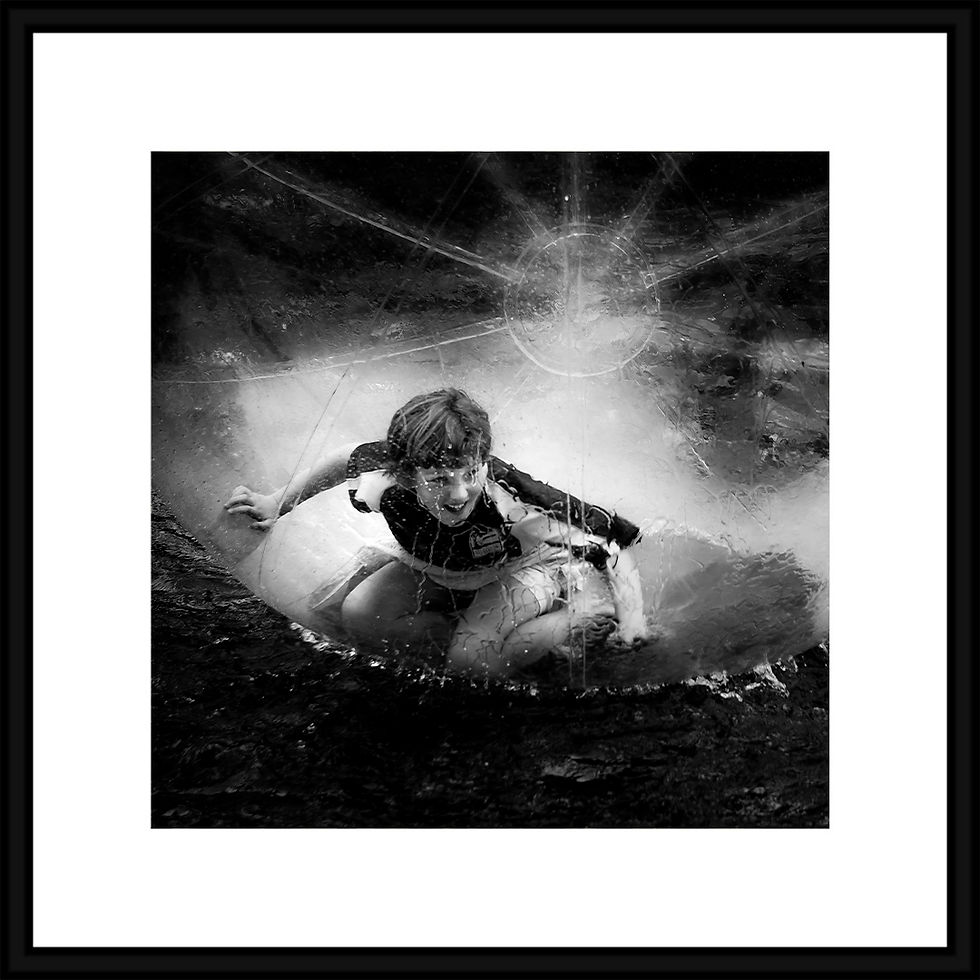 Les enfants s'amusent dans des bulles dont les lumières des fêtes foraines se reflètent sur ces sphères translucides. Leurs visages affichent des expressions pleines de joie mais aussi d'inquiétude. Dans ce scénario enchanté, les bulles deviennent des petites galaxies où les enfants se déplacent, sautent et jouent. Ils semblent être transportés dans un monde parallèle, où la réalité se mélange avec un soupçon de fantaisie. Les bulles flottent gracieusement sur l'eau, créant des scènes spontanées, toutes différentes selon comment l'enfant appréhende ce jeu . C'est dans cet univers éphémère que l'enfance trouve son essence, la spontanéité et la pureté des émotions.